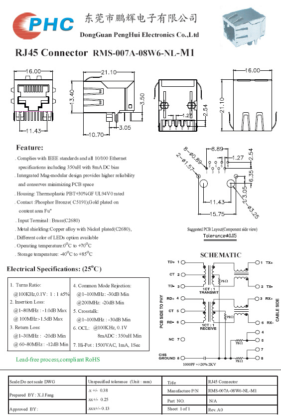 RMS-007A-08W6-NL-M RJ45母座、RJ45带滤波器、RJ45以太网接口