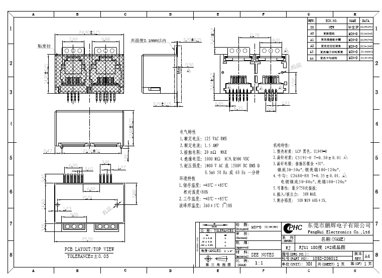 RJ11SMT 4P4C 180度 电话连接器单口(PH1052-204003)