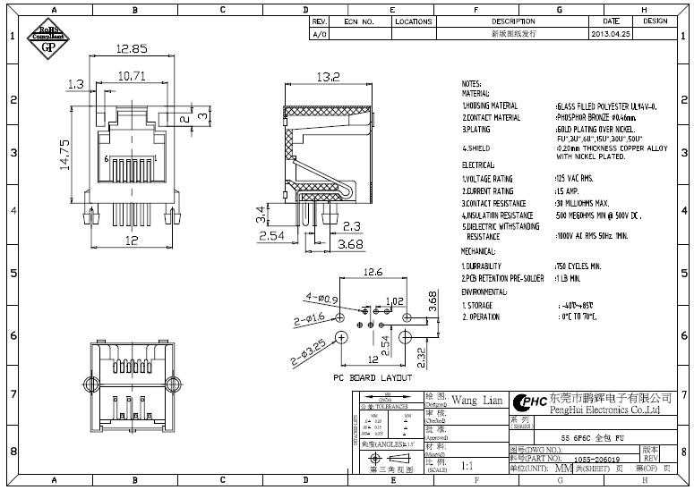 1055-206019 55 6P6C 带屏蔽无耳 RJ11电话插座