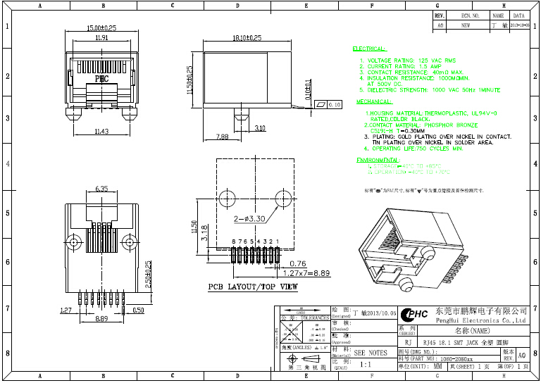 订购:RJ45 SMT贴片网络连接器有塑胶脚(PH1056-208097)