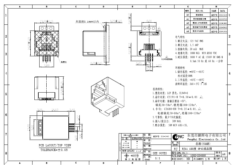 订购:RJ11SMT 4P4C 180度 电话连接器单口(PH1052-204003)